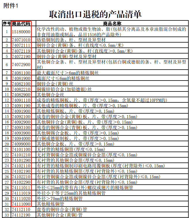 关于打消出口退税的产物清单,总共包含59个产物,除了通知布告提到的产物,好比精辟铜管、其他铜合金条等,根基都是金属材料一类。