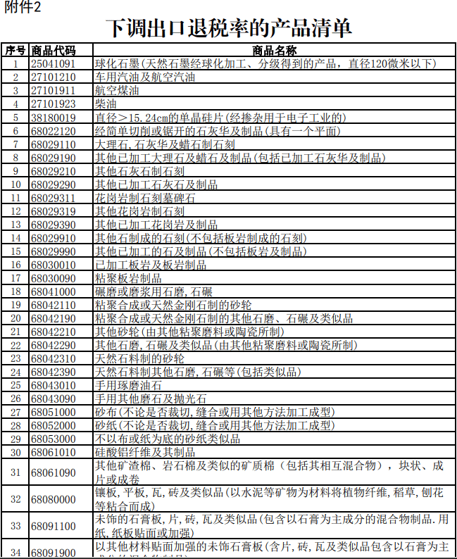 一是:打消不产产物的出口退税,包罗化学改性的动、动物或微生物油、脂,铝合金制空心异型材、铜锌合金丝等产物。二是:将部门产物的出口退税率由13%下调至9%,好比成本油、光伏,电池、部门非金属矿物成品。三是:该通知布告自2024年12月1日起实施。而且表白通知布告所列产物合用的出口退税率以出口货色报关单说明的出口日期界定。