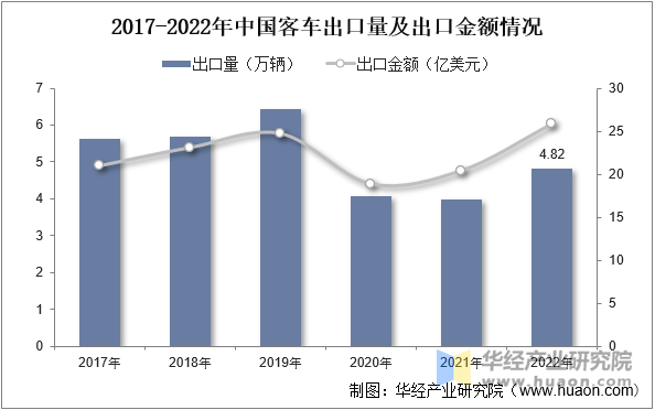 我国客车次要以出口商业为从,出口规模弘远于进口规模。跟着近年来我国客车行业的不竭成长,我国客车出口规模也随之不竭扩张,2020年受疫情影响,市场需求大幅下降,使得我国客车出口规模呈现大幅度下降。跟着疫情被无效节制,全球市场需求逐渐回升,出口规模起头逐渐回升。据材料显示,2022年我国客车出口量为4。82万辆,同比增加21。1%;出口金额为25。8亿美元,同比增加26。6%。