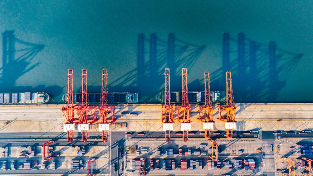2025年1月13日,正在山东口岸青岛前湾港,拆载外贸集拆箱的货轮停靠船埠(无人机照片)。发(俞方平摄)?。